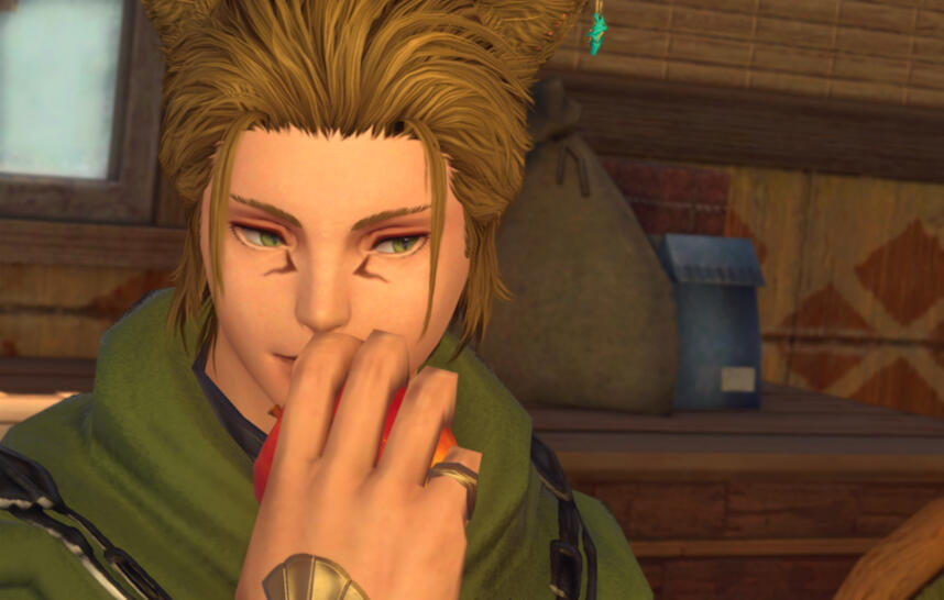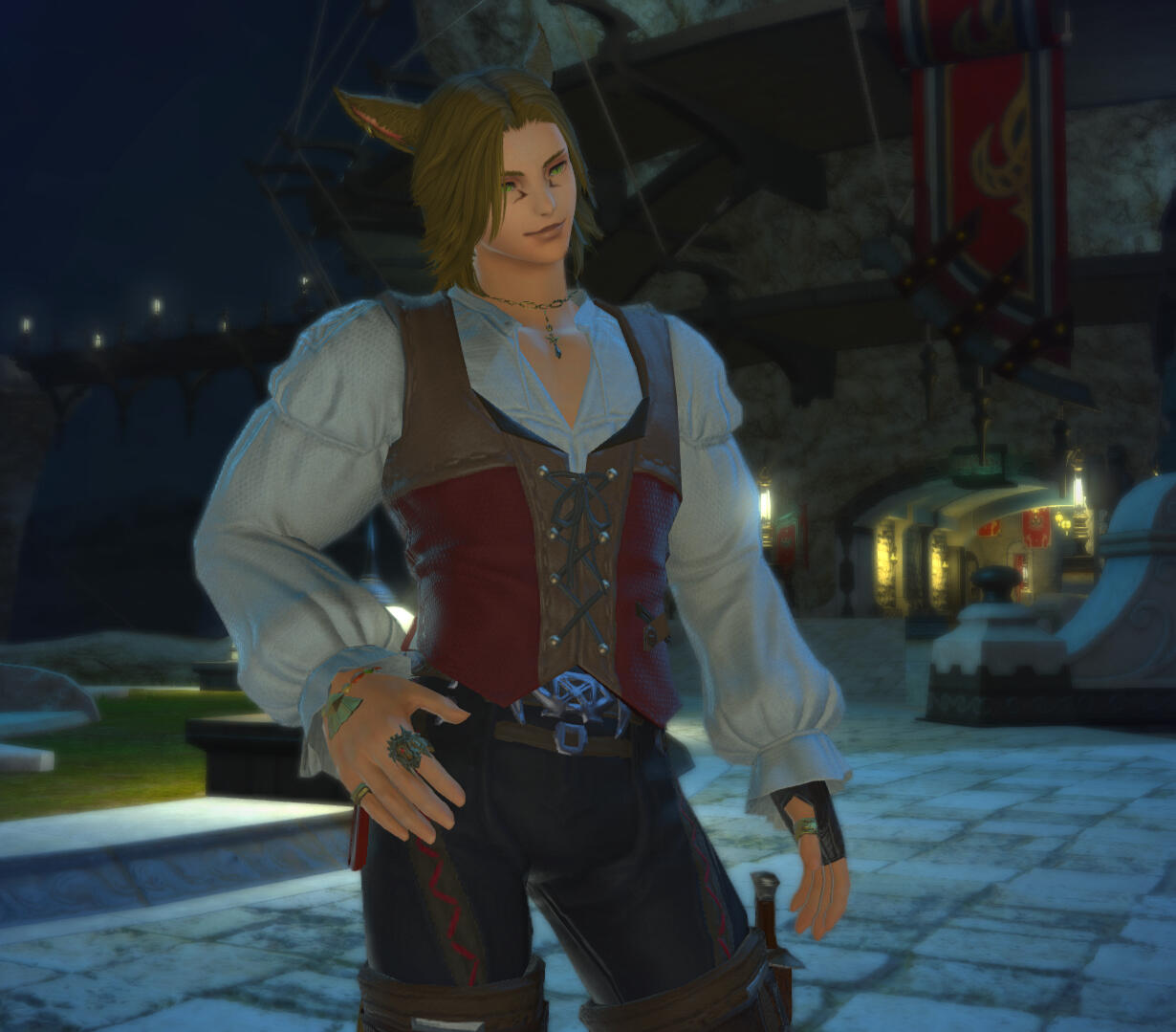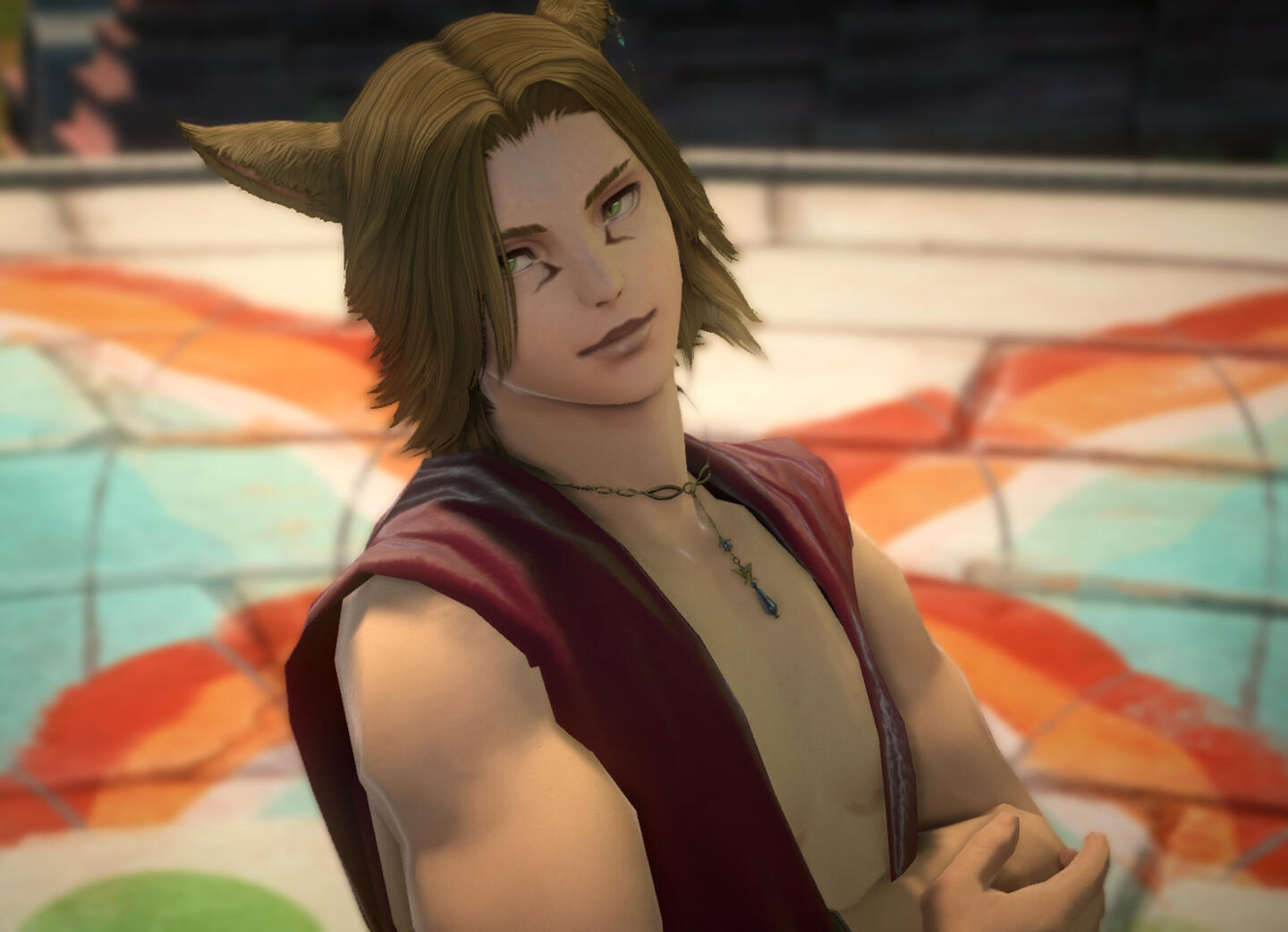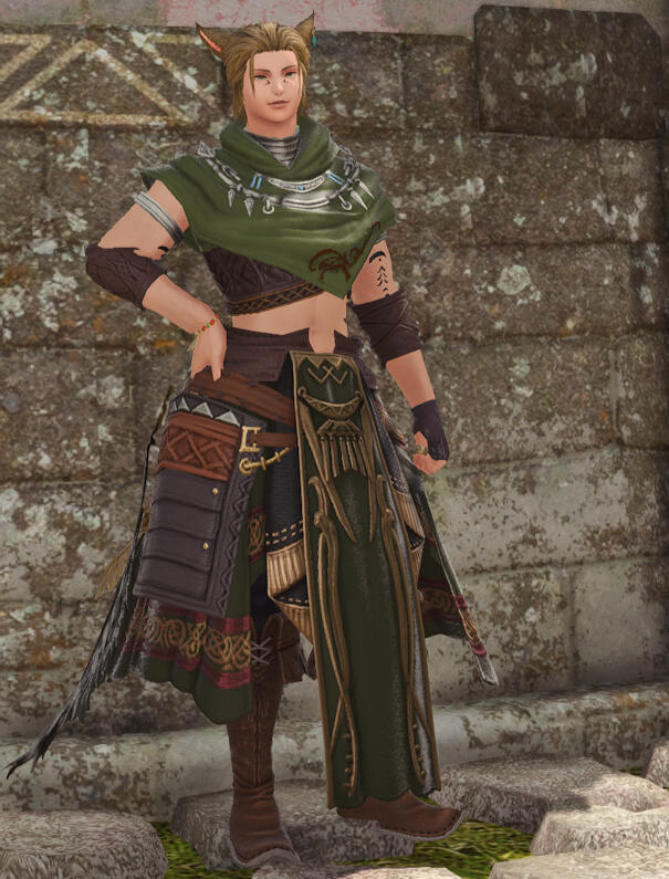F'zeem's father gained Nunh status by claiming and holding new lands in La Noscea, just outside Cedarwood. Most of the branch tribe became farmers, woodcutters, and carpenters, though several remained hunters. F'zeem is firstborn to his father, and the only child of his mother. He has 7 half-siblings split between his father's 4 other partners. His next-oldest sibling is about a year younger than him, while his youngest sibling is about 14 years old. His father was unseated as Nunh not long after his last sibling was born, and is now a Tia; he is the primary educator for the tribe's young ones & sometimes advises the new Nunh.F'zeem was trained to hunt with a bow by his father. His half-brothers & other Tias of the tribe are highly competitive, and he often butt heads with them every time they challenged him. When he came of age, F'zeem went on a hunt on his own, acted recklessly, and received a head injury that developed into a terrible ear infection. He was found by a younger sibling & was brought to Limsa Lominsa for treatment. The infection significantly damaged his hearing. He stayed in Limsa Lominsa to attend a school for the deaf, where he learned Eorzean sign language & lipreading. He also received a more comprehensive education, which led to an interest in technology.Current: